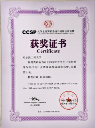 2020 CCF大学生计算机系统与程序设计竞赛(CCSP)于1017日在全国的64CSP认证点高校举办,来自全国67所高校的1016名选手参赛。我校成绩全国排名第十,在工信部七所学校中排名第一。其中张凌源同学获得个人东北区第一,全国第十四的好成绩。