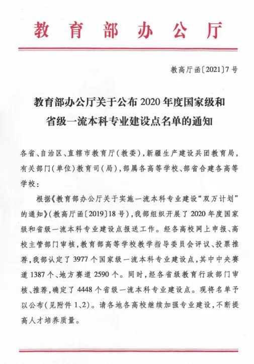 近日,教育部办公厅下发了《关于公布2020年度国家级和省级一流本科专业建设点名单的通知》(教高厅函【2021】7号),kaiyun开云官方软件工程专业获批国家级一流专业建设点,信息安全专业获批省级一流专业建设点。开云官网的计算机科学与技术专业于2019年获批国家级一流专业建设点,目前开云官网在办的三个专业全部入选“双万计划”一流专业建设行列。