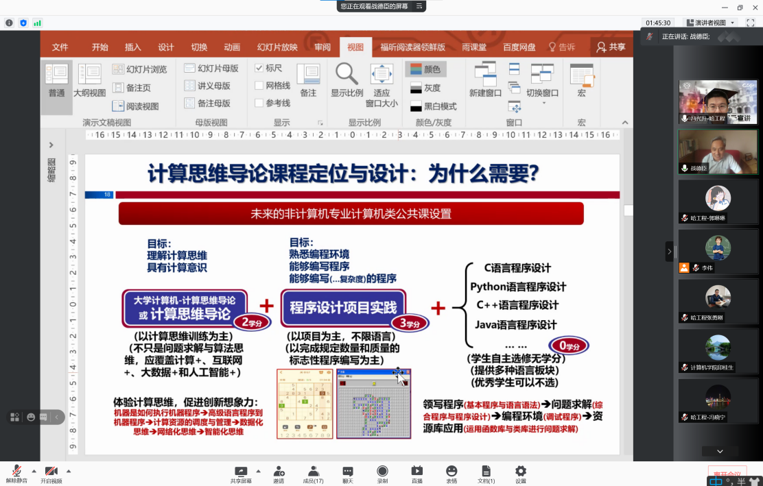 会上,蔡成涛院长、张勇刚常务副院长、印桂生教授对学院整体情况、课程建设思路进行介绍,李伟副教授详细汇报了课程建设相关内容,包括课程设置依据与培养目标、课程方案制定思路、课程建设成果等。几位专家针对汇报内容进行了专业点评,主要强调了“计算思维”课程要和未来技术学院的专业进行融合,以项目贯穿课程的方式进行教学,着重培养学生的思维能力和设计能力,对于课程性质、课程目标与考核方式等内容提出了宝贵意见和建议。