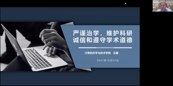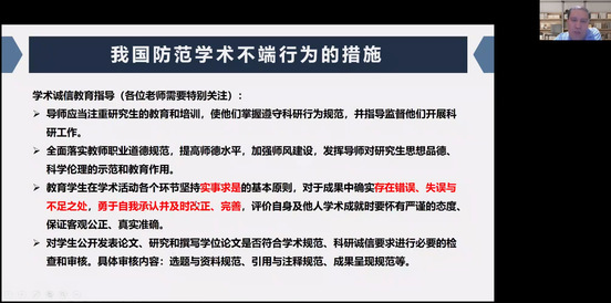 主讲内容以严谨治学,维护科研诚信和遵守学术道德为重点,围绕着科研诚信的概念、学术不端行为表现、学术不端行为危害、学术不端行为成因、以及学术不端防范措施一共五个方面,阐述了维护科研诚信和遵守学术道德的必要性。不仅从教师自身角度,更是从导师指导学生的角度进行了生动的讲解,内涵丰富,内容充实,广受教师好评。