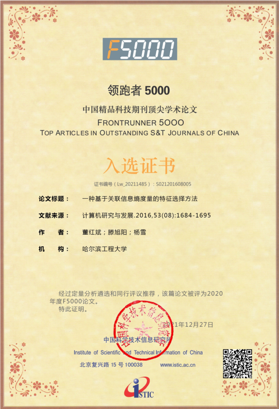 开云官网软件与社会计算团队董红斌教授为第一作者的论文《一种基于关联信息熵度量的特种选择方法》于2016年在《计算机研究与发展》期刊发表。2021年入选“中国精品科技期刊顶尖学术论文-领跑者5000”(F5000)。