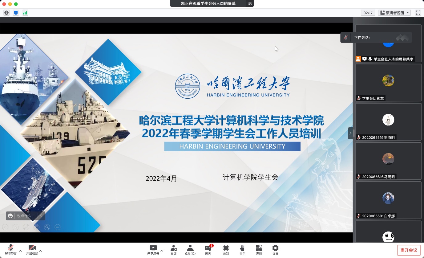 2022年4月14日,kaiyun开云官方学生会召开2022年度春季学期全体工作人员培训会议。本次培训主讲人为学生会主席张人杰。