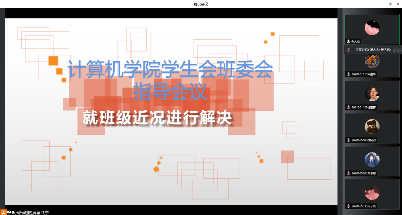 本次会议的主题是“就班级近况问题进行解决”。经过上次会议的培训和近期的班委问题反馈,张人杰,以自己为例,讲述了自己的学生工作经历,对一些班委共性存在问题进行一一解答。