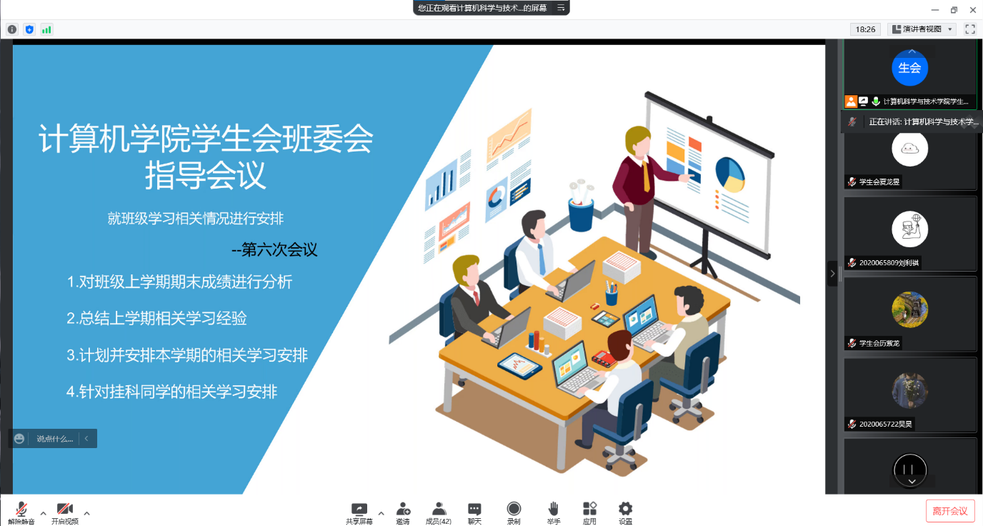本次会议的主题是“对班级学习的几点建议”。历紫龙对于各班上学期的期末成绩进行了简单分享,总结了上学期各班的学习情况,对于各班同学的几点学习建议。