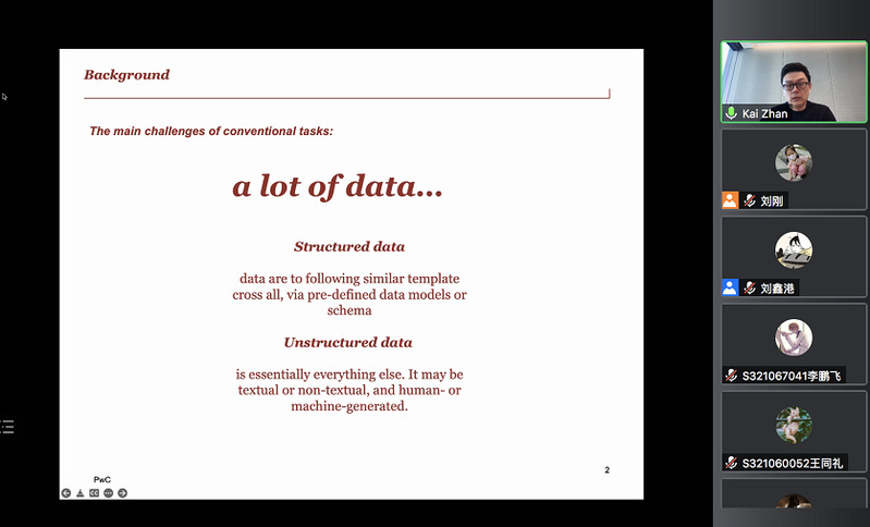 2022年6月14日,kaiyun开云官方举行2022年第三期(总第七期)智汇论坛。本次活动邀请普华永道澳大利亚首席数据科学家和高级经理Kai Zhan,以“机器学习在咨询审计领域的应用”为题作专题讲座。