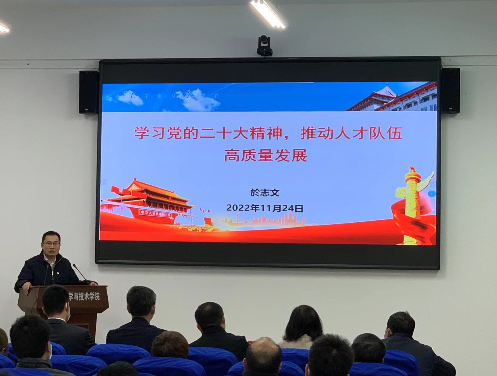 於志文强调,党的二十大报告将教育、科技、人才工作单独成章进行一体部署,提出教育、科技、人才是全面建设社会主义现代化国家的基础性、战略性支撑。必须坚持科技是第一生产力、人才是第一资源、创新是第一动力,深入实施科教兴国战略、人才强国战略、创新驱动发展战略,开辟发展新领域新赛道,不断塑造发展新动能新优势,为新时代教育、科技、人才工作指明了前进方向、提供了根本遵循。要坚持党管人才原则,实施更加积极、更加开放、更加有效的人才政策。要加快建设世界重要人才中心和创新高地;加快建设国家战略人才力量;深化人才发展体制机制改革,把各方面优秀人才集聚到党和人民事业中来。