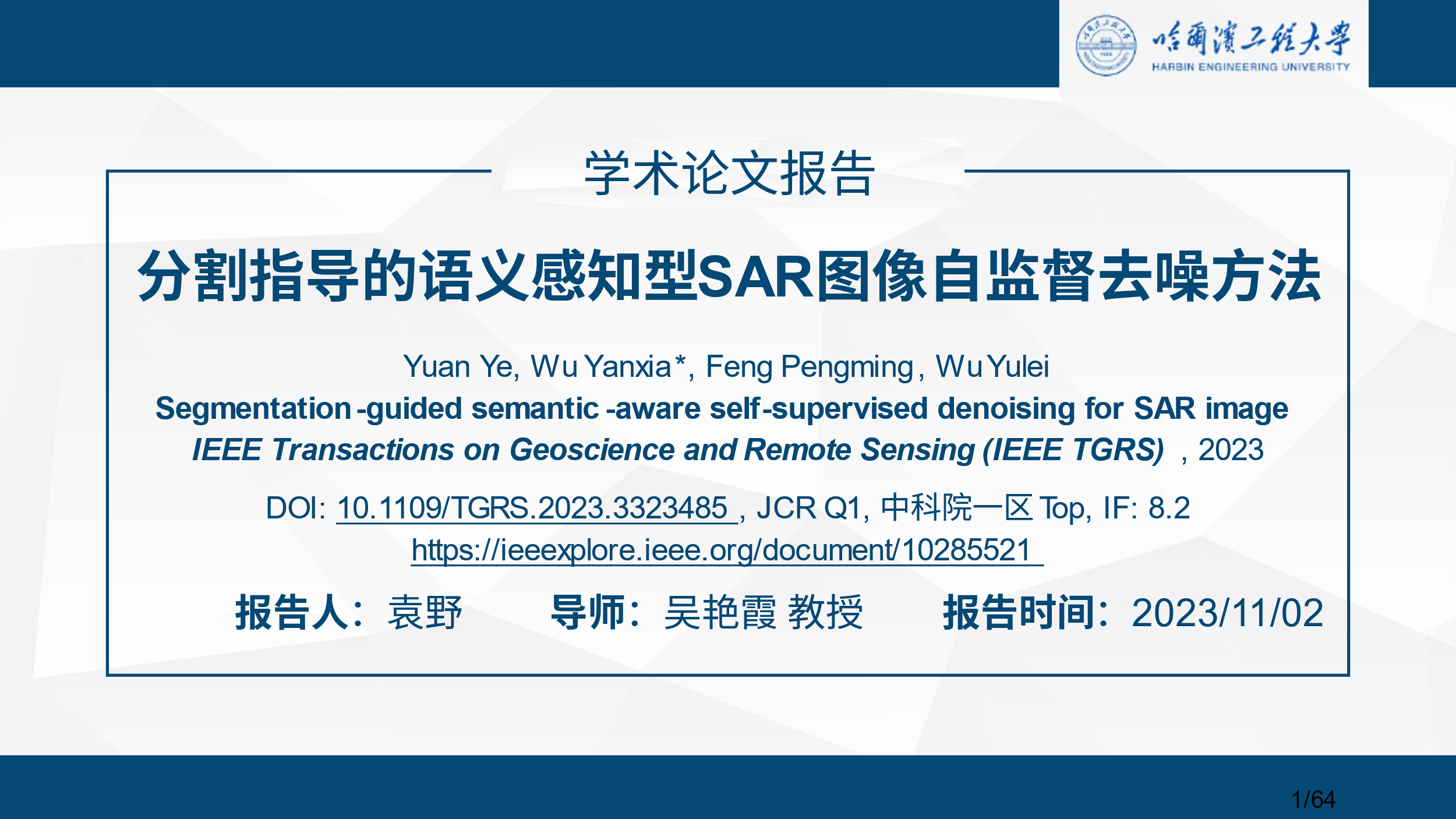 2023年11月2日,kaiyun开云官方在21#4017举办了博士论坛第二期,本次论坛邀请了kaiyun开云官方吴艳霞教授指导的2018级博士研究生袁野,以“分割指导的语义感知型SAR图像自监督去噪方法”为主题进行学术报告,学院多名在校硕士及博士研究生参加了活动。此项研究成果在遥感领域顶级国际期刊IEEE Transactions on Geoscience and Remote Sensing(IEEE TGRS)发表。