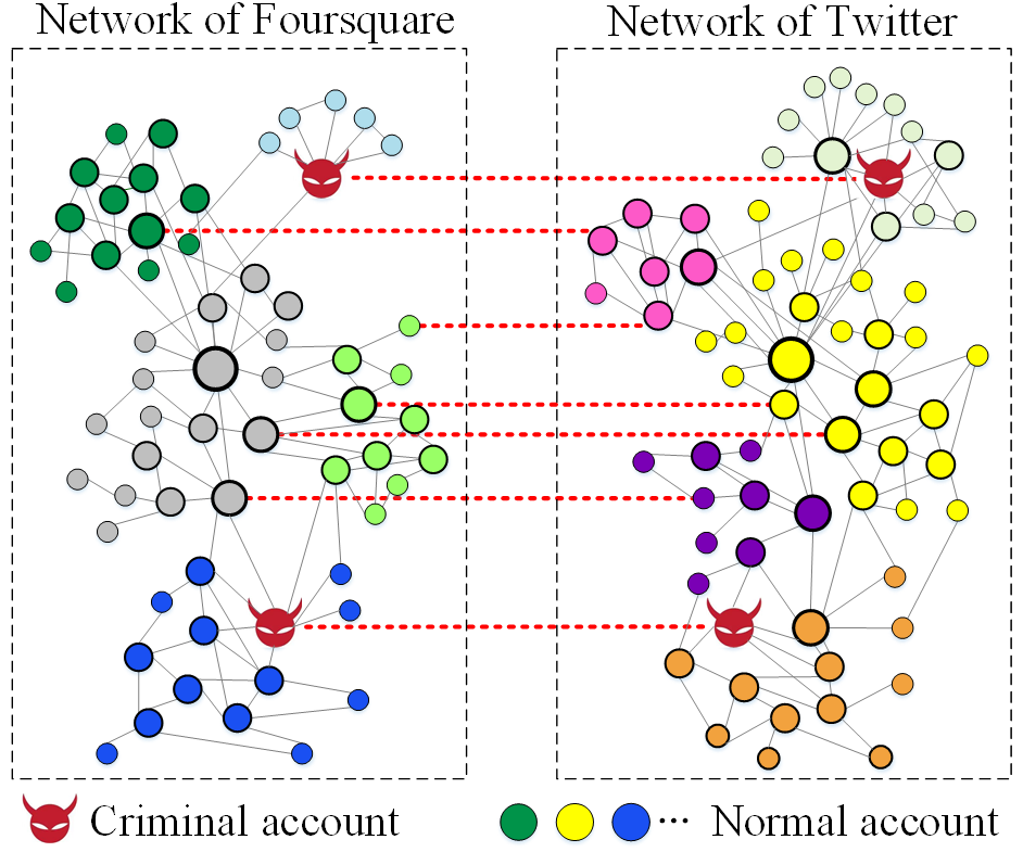 开云官网发表成果旨在研究针对多社交网络取证场景下的用户去匿名化技术,为跨网络犯罪取证提供了坚实的数据支撑。由于不同的社交网络所提供的服务不同,社交网络的服务语义之间存在明显差异,相同用户在不同的社交网络中的所扮演的角色也随之改变。不同的服务语义特征造成的角色特征淹没,严重制约了跨网络去匿名化的性能。