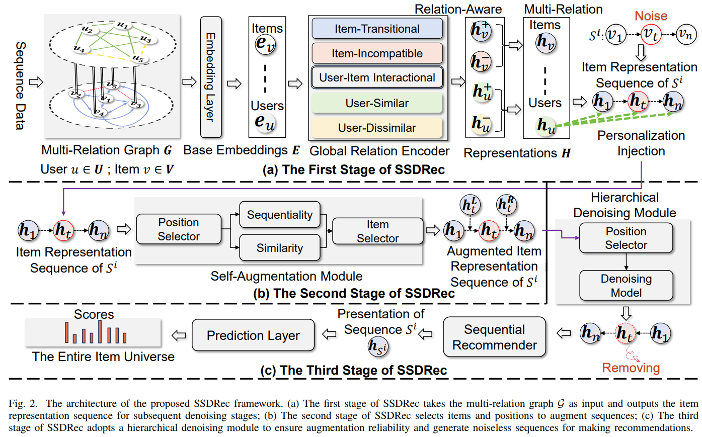 针对短期序列数据降噪过程中的过降噪和欠降噪问题(OUPs),该文提出了三阶段学习范式的SSDRec框架,在序列降噪之前执行显式的序列增强技术,从全局数据中选择合理的对象插入到目标序列中,最大程度减少对原始序列的扰动,丰富序列的可学习信息。