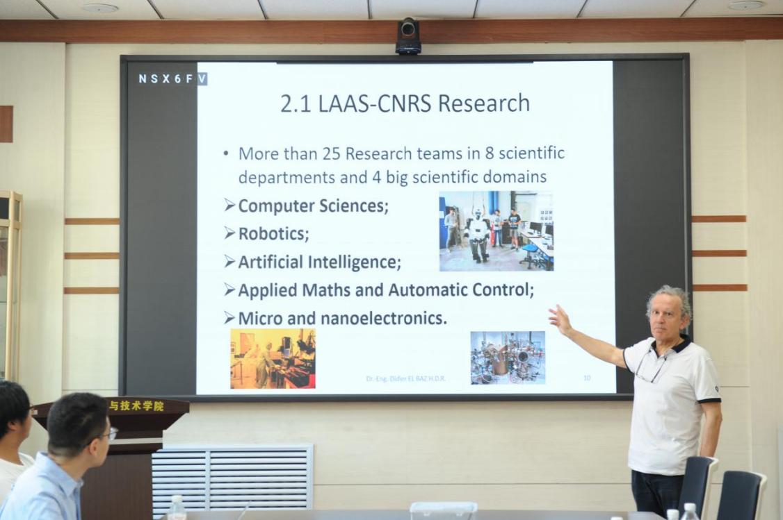 会上Didier教授介绍了法国图卢兹历史、图卢兹大学、LAAS-CNRS研究所和自己的研究工作,王巍副院长和Didier教授讨论了纯英文教学工作,李伟助理和Rahul老师与Didier教授讨论了共同申报国家外国专家项目,双方对研究课题和内容展开深入探索。