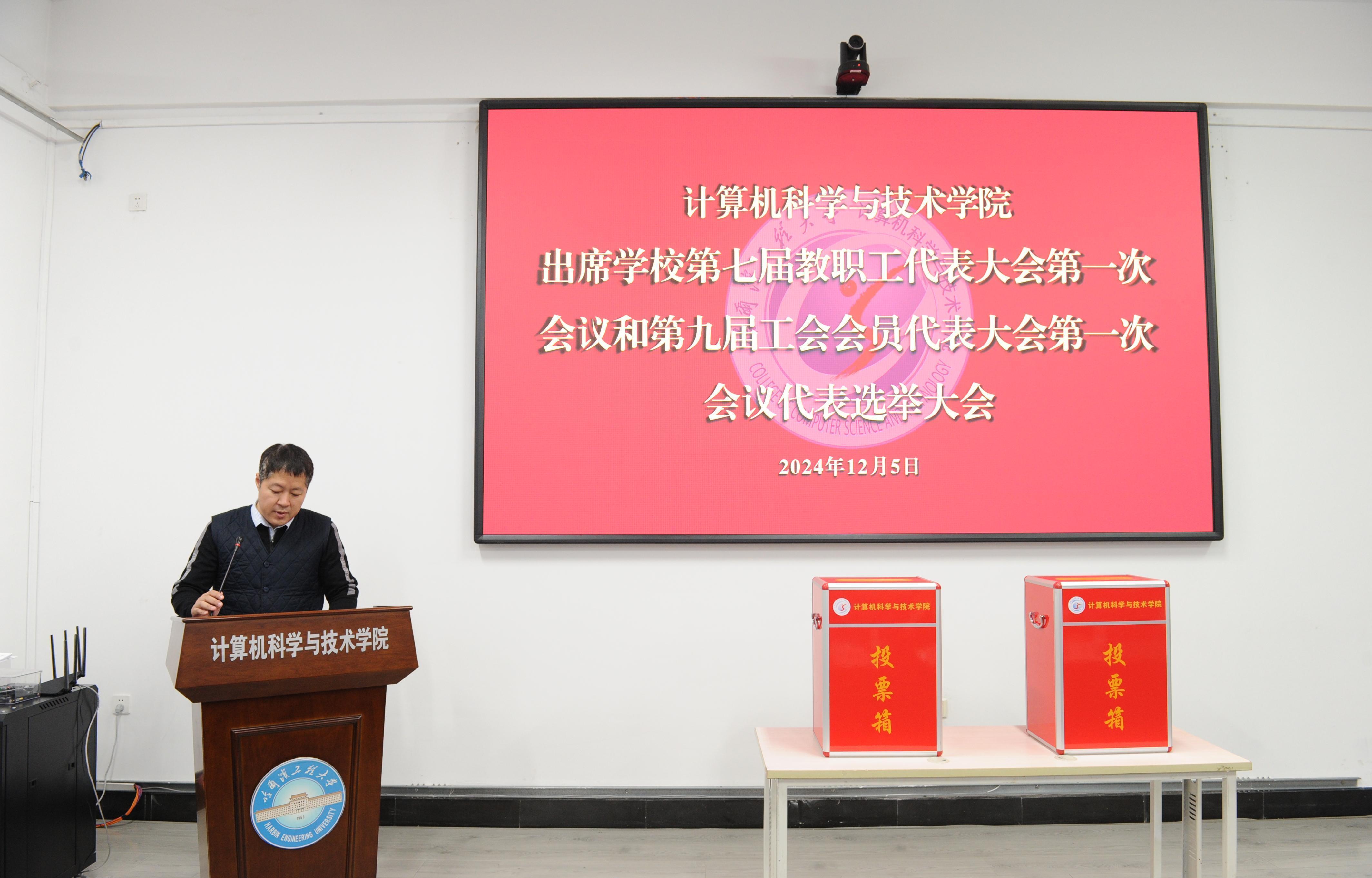 会议先后通过了《计算机学院关于出席学校第七届教职工代表大会第一次会议和第九届工会会员代表大会第一次会议代表选举办法》及监票人名单;会上宣读了《学院出席第七届教职工代表大会第一次会议和第九届工会会员代表大会第一次会议代表候选人的批复》。随后采用无记名投票、差额选举的方式进行了选举,与会人员认真填写选票,投上了自己神圣而庄严的一票,最终选举出12名出席学校教代会及工代会的代表。