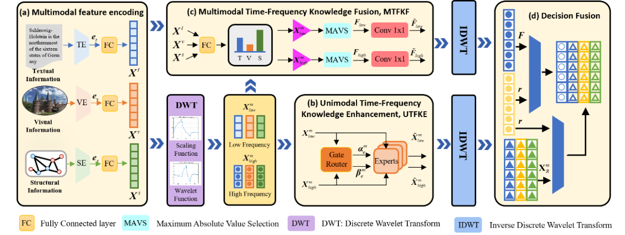 工作简介:多模态链接预测是一种融合结构化知识与非结构化信息的知识图谱推理任务,旨在利用多个模态信息提高实体、关系预测的准确性。然而,现有多模态知识图谱链接预测方法聚焦于在空间域中对实体的文本、图像与结构三种模态信息进行建模,针对模态间原始信号所呈现的高度异质性,通常依赖于复杂的跨态交互机制以实现知识融合。为解决上述问题,本文提出一种基于小波变换的多模态知识图谱链接预测方法WFFWavelet-based Filter&Fusion),该方法在时频域中将原始信号分解为正交的时频分量,不同模态特征被映射至正交函数空间中具有差异性的分布表示,通过对不同模态的多尺度时频信息进行自适应滤波以抑制模态内无关成分,有效避免了空间域中复杂的噪声抑制过程;该方法同时结合可学习门控机制与多模态时频最大绝对值选择策略,在时频域内高效融合结构、文本、图像、音频与视频等多种模态间的互补信息,从函数空间层面解决多模态融合过程中的分布对齐难题。在实现单模态时频知识增强与多模态时频知识融合的基础上,该方法进一步通过逆离散小波变换将单模态与融合后的时频表示重构至空间域,并基于其空间嵌入完成决策融合。