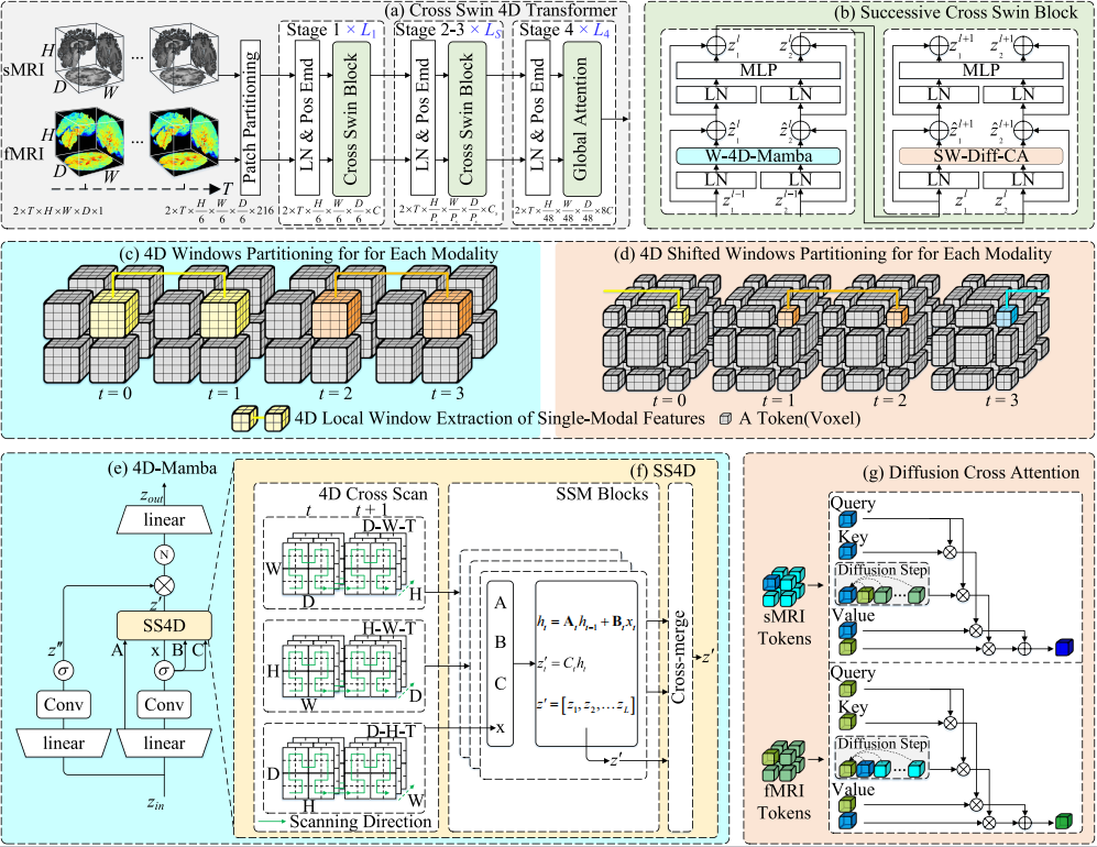 工作简介:多模态高维脑成像数据的时空动态建模任务给神经科学领域带来了巨大的挑战。近期的工作通常结合注意力机制进行层次化建模,但时空特征的逐步提取存在特征孤立问题,且基于注意力的融合机制(如Cross attentionCA)更倾向于学习不同模态间的自相似性信息,对差异化模态之间的互补性信息挖掘不足。为了应对这些挑战,本文提出了Cross Swin 4D TransformerCrosST),可以通过端到端的方式高效的学习多模态高维脑成像数据的时空模式。CrosST独有的Diffusion Cross attention融合机制在计算注意力的过程中,通过扩散策略连接不同模态的特征,传递模态间的差异信息,从而实现多模态耦合特征的深层次融合。同时,采用对应体素交互策略减轻了融合过程中的计算负担。此外,CrosST采用4D移动窗口技术有效结合了局部和全局信息,并设计了创新性的4D-Mamba算法提升了计算效率。本文采用了大规模阿尔兹海默症数据集,并设计了多粒度的认知阶段任务进行验证,结果证明了CrosST的有效性。