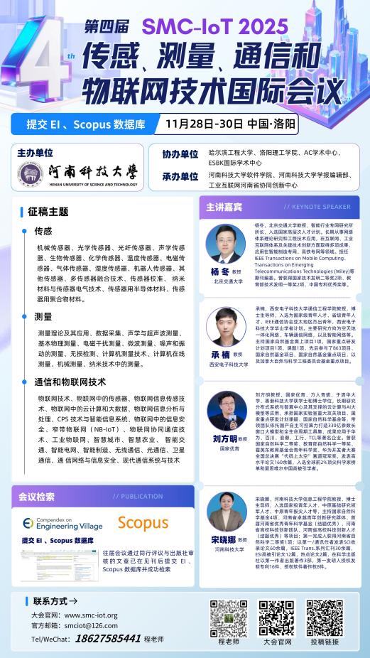 第四届传感、测量、通信和物联网技术国际会议(SMC-IoT 2025)将于2025 年 11 月 28-30 日在中国洛阳召开。会议由河南科技大学主办,kaiyun开云官方、洛阳理工学院、ESBK国际学术交流中心、AC学术平台协办。在本次会议上发表的文章将出版到SMC-IoT 2025会议论文集,并提交EI数据库。