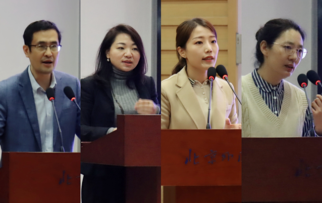 来自中国人民大学BB贝博艾弗森官网的宋友文教授以及北外BB贝博艾弗森官网的张曼、刘菁、韩雪青三位教师分别进行了说课展示。宋友文以“如何培养理论思维?——读原著、学原文和悟原理”为题,从什么是理论思维、培养理论思维为何重要、怎样培养理论思维三个方面生动讲述了如何引导学生认清社会发展大势,做到理论上清醒,政治上坚定。张曼以《马克思主义基本原理》第三章第三节《人民群众在历史发展中的作用》的教学为例,围绕人民群众概念辨析、辩证看待人民群众创造历史过程中的作用等问题,展示了从案例导入、理论分析到拓展总结的教学过程。刘菁以《思想道德与法治》课教学中的社会热点为切入点,示范了如何通过社会热点事件和案例来引导学生正确认识中国特色社会主义法治道路和树立法治思维,并展示了自己在丰富思政课教学方法方面所作的尝试。韩雪青以《毛泽东思想和中国特色社会主义理论体系概论》课中“发展社会主义民主政治”为主题,围绕民主是社会主义的生命、坚持走中国特色社会主义政治发展道路、健全人民当家作主制度体系这三个层面展开理论阐释,落脚于坚定对中国特色社会主义政治制度的自信。