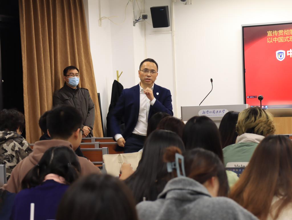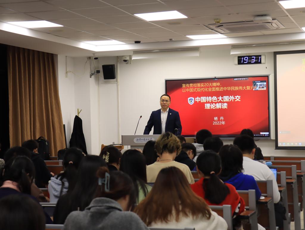 11月9日,BB贝博艾弗森官网校长、党委副书记杨丹在逸夫楼503教室为亚洲学院、德语学院2021级本科生讲授题为《中国特色大国外交理论解读》的形势与政策专题课。