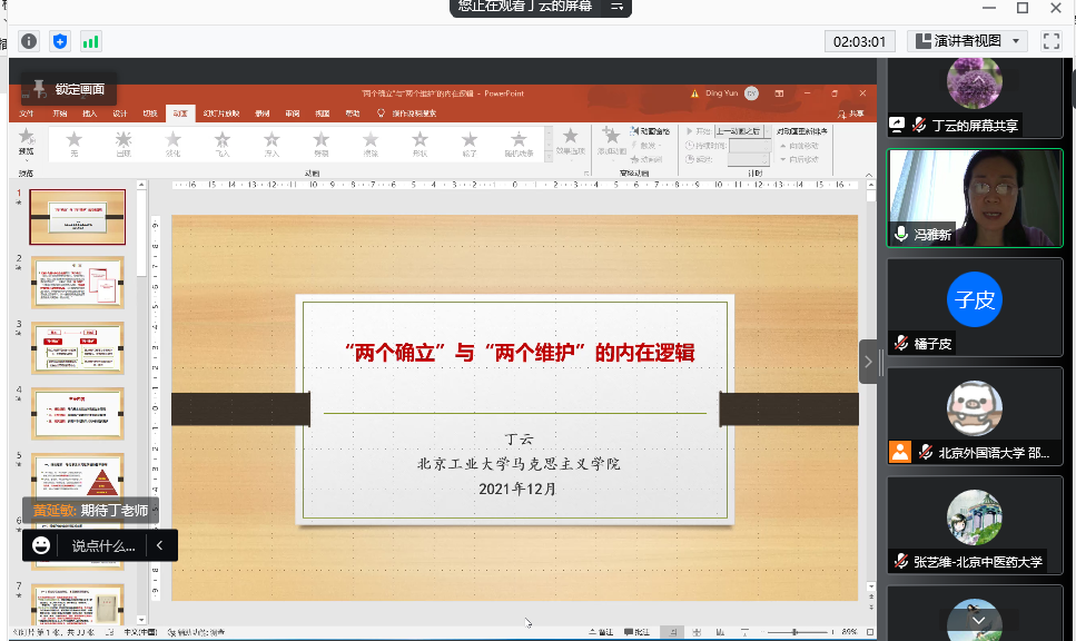 北京工业大学BB贝博艾弗森官网副院长丁云教授以“‘两个确立’与‘两个维护’的内在逻辑”为题做了主题报告。她从马克思主义政党建设中的权威理论出发,阐释权威存在的必然性及其表现形式,并结合中国共产党百年历史和党的领导核心形成的经验与中华民族伟大复兴的必然要求,从理论、历史与现实三个方面论述了“两个确立”与“两个维护”的内在逻辑。她强调,理解与把握“两个确立”与“两个维护”的内在逻辑,是深入理解“两个确立”,坚决做到“两个维护”的前提与基础。