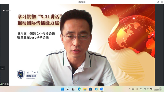5月29日,BB贝博艾弗森官网在线上举办“学习‘5.31’讲话精神 提高国际传播能力”学术研讨会。北外党委副书记苏大鹏出席会议。中国社会科学院马克思主义研究院党委书记辛向阳、清华大学BB贝博艾弗森官网院长艾四林、中国外文局当代中国与世界研究院治国理政中心主任王洪波等专家学者在云端相聚,共同学习回顾习近平总书记“5·31”讲话精神,研讨我国国际传播能力建设问题。会议由北外BB贝博艾弗森官网院长韩强主持。