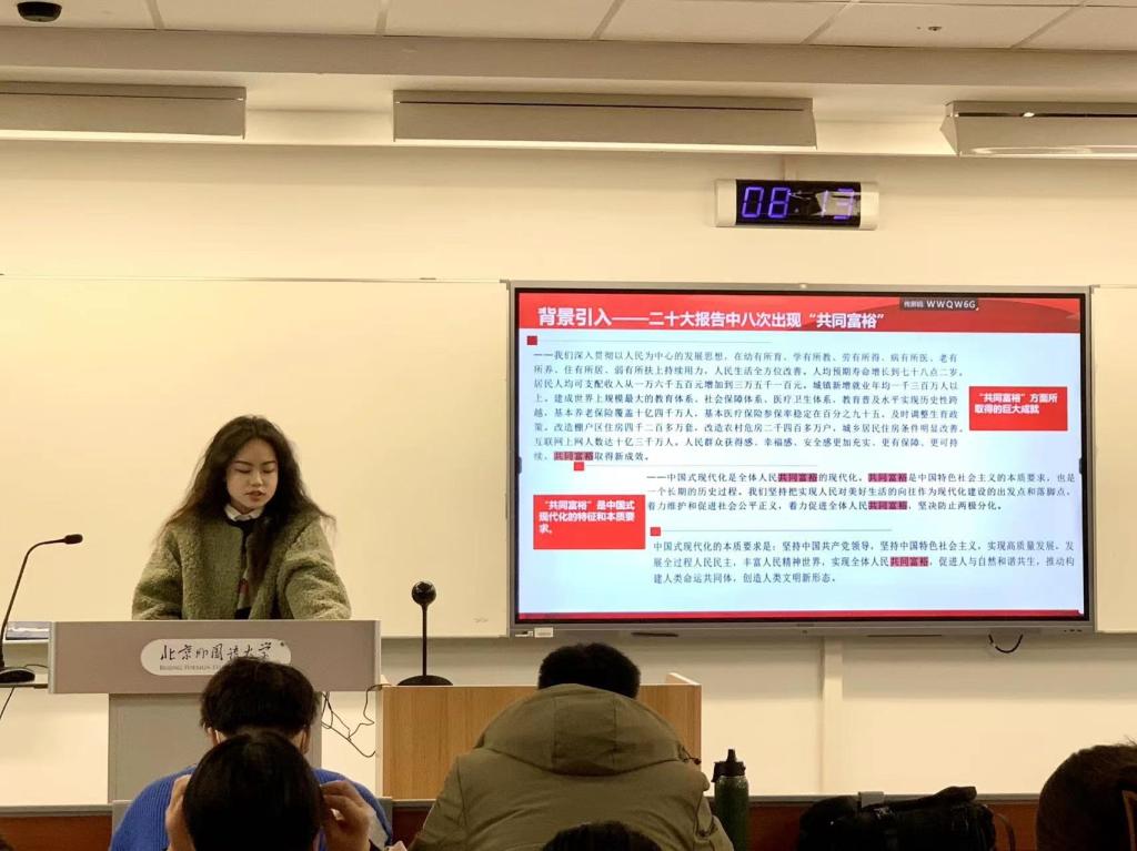 预备党员冯子妍重点阐述了了二十大报告中“扎实推进全体人民共同富裕”部分。冯子妍指出,在党的二十大报告中,先后八次出现“共同富裕”这一关键词。她根据关键词出现的位置对其深刻内涵做了简要分析,其中主要包括党领导人民在“共同富裕”方面所取得的巨大成就,“共同富裕”作为中国式现代化的五大特征之一以及中国式现代化的本质要求的重要现实意义,在2035年我国发展的总体目标中提出“全体人民共同富裕取得更为明显的实质性进展”的深远意义等。冯子妍从“是什么”、“为什么”和“怎么办”三个方面来解读“共同富裕”,强调“共同富裕”贯穿于过去、现在和未来,贯穿于中国式现代化道路形成和拓展的历史进程中。在向第二个百年奋斗目标迈进的伟大征程中,必须把促进全体人民共同富裕作为为人民谋幸福的着力点和出发点。