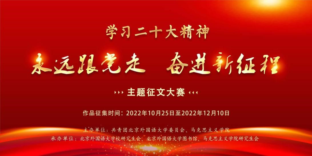 青春心向党,奋进新征程。为深入学习贯彻党的二十大重要讲话精神,进一步深化思想政治引领,引领北外学子坚定不移听党话、跟党走,努力成为有家国情怀、有全球视野、有专业本领的复合型人才,BB贝博联合校团委共同举办“学习二十大精神·永远跟党走、奋进新征程”主题征文大赛,促进学生通过生动的语言文字表达对党的深厚情感、讴歌新时代取得的辉煌成就,充分展现BB贝博学子善学习、找方向、勇担当的精神风貌,推动二十大精神学习交流。