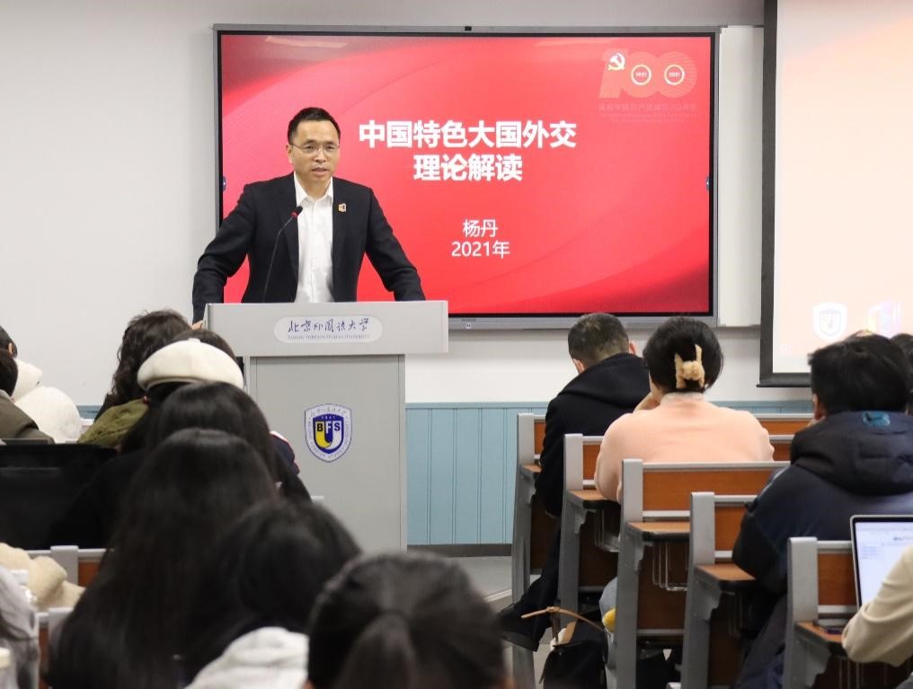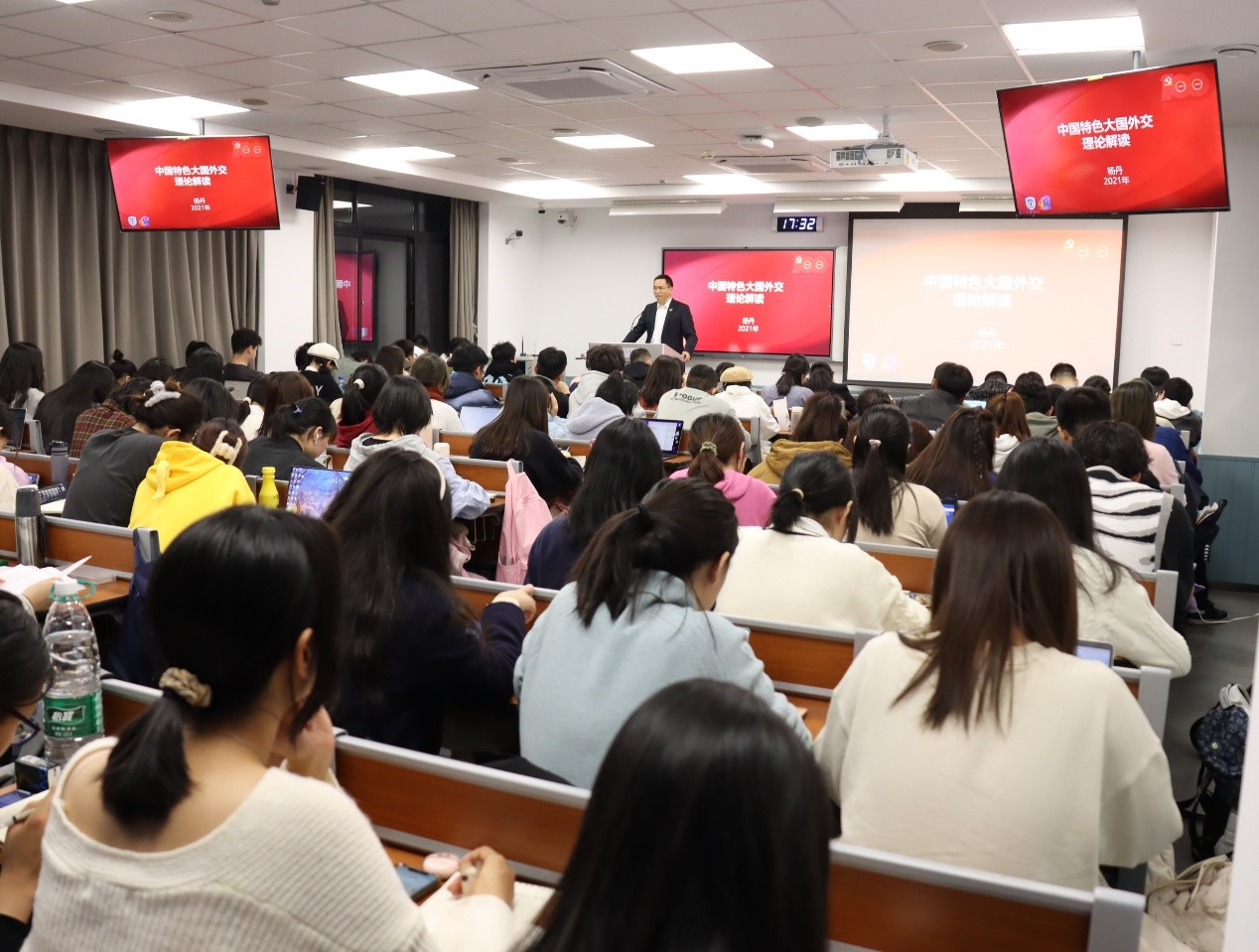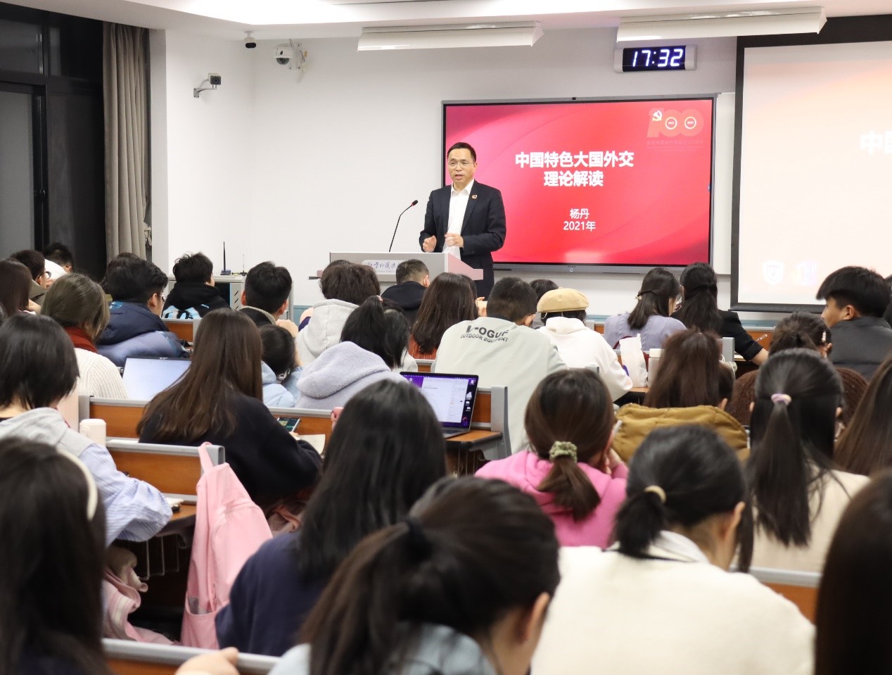 12月8日,BB贝博艾弗森官网校长、党委副书记杨丹教授在逸夫楼为国际商学院2021级本科生讲授了题为《中国特色大国外交的理论解读》的形势与政策专题课。