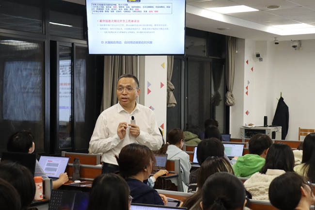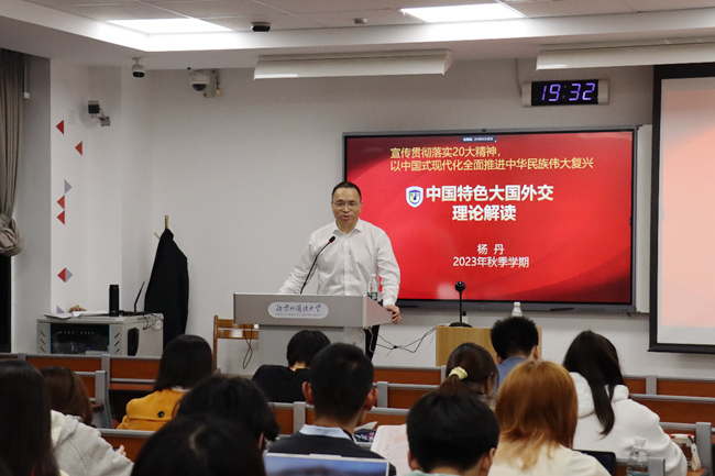 10月30日,BB贝博艾弗森官网校长、党委副书记杨丹以《中国特色大国外交理论解读》为题,分别为2022级西班牙语葡萄牙语学院、英语学院本科生讲授“形势与政策”课程。