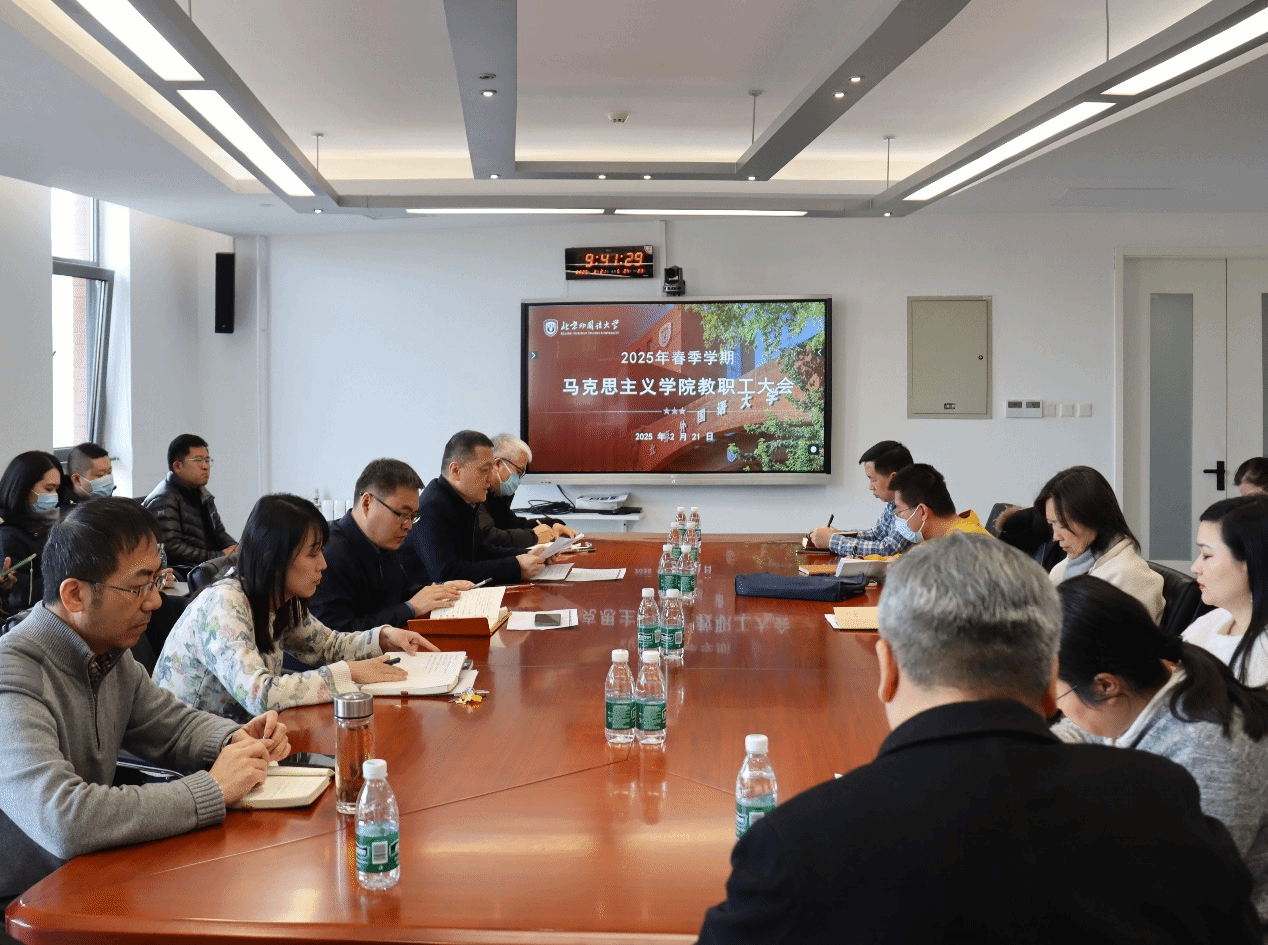 院长韩强传达了BB贝博艾弗森官网2025年春季学期工作部署会精神,围绕《BB贝博艾弗森官网2025年工作要点》的要求,结合本院实际,布置新学期相关工作。他强调新学期要进一步加强习近平新时代中国特色社会主义思想的学理化研究阐释,高质量办好思政课,提升教学科研和学科建设水平,抢抓发展机遇,推动“高水平、有特色、国际化”的北外马院建设再上新台阶。