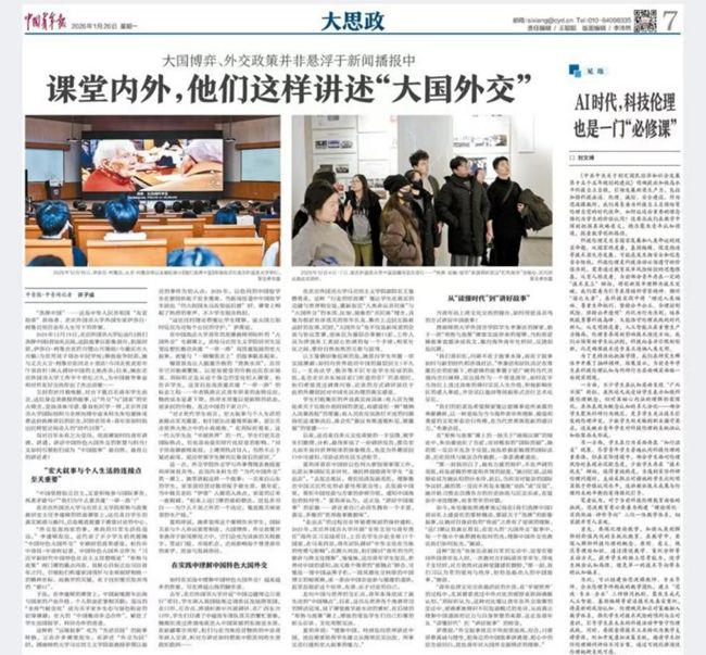 1月26日,《中国青年报》大思政专题“课堂内外,他们这样讲述‘大国外交’”刊发了北外思政课育人成效为主要内容的专题报道。2023级国际关系学院本科生朱怡璇,BB贝博艾弗森官网副院长王曼倩、形势与政策教研室主任李建嵘接受了专题采访。采访内容详实介绍了北外思政课指导学生将宏大叙事与个人生活连接,在实践中理解中国特色大国外交,从读懂时代到讲好中国故事的建设实践和育人成效。