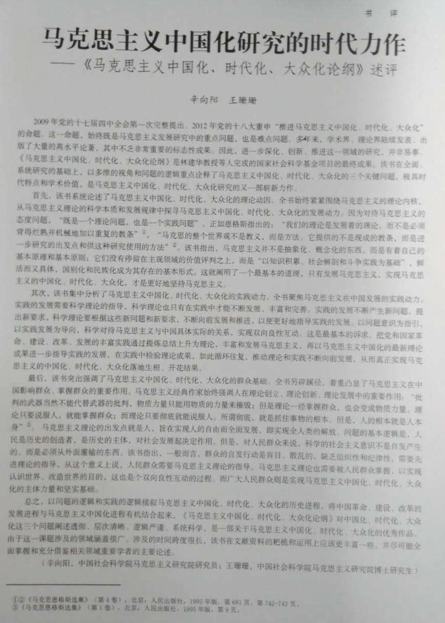 近日,《东岳论丛》2017年第1期发表辛向阳、王珊珊文章。改文章以“马克思主义中国化研究的时代力作”为题,评述了林建华教授的专著《马克思主义中国化、时代化、大众化论纲》。文章认为,该书通过问题的逻辑和实践的逻辑的结合,描述了马克思主义中国化、时代化、大众化的历史进程,将中国革命、建设、改革的发展进程与马克思主义中国化进程有机结合起来。