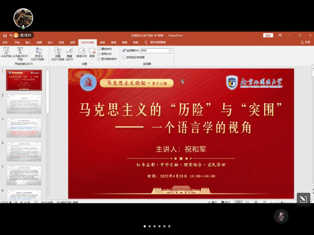 4月29日下午,北外马院马克思主义论坛第十三期顺利开讲。BB贝博艾弗森官网党总支书记祝和军以“马克思主义的‘历险’与‘突围’——一个语言学的视角”为题做了专题讲座。本次活动由2020级硕士研究生姜伟秋主持,共有包括北外马院师生在内的近百余人参会。