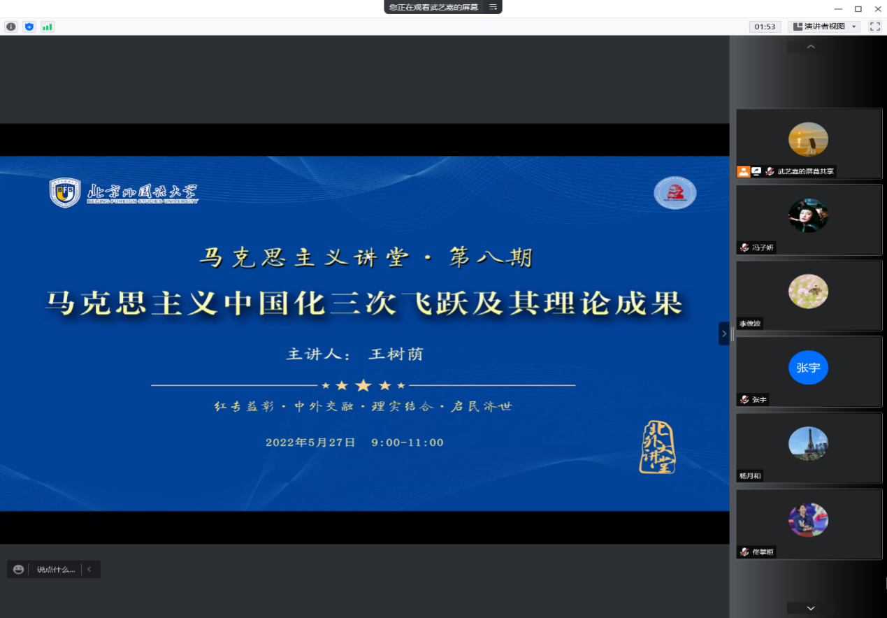 5月27日上午,北外马克思主义讲堂第八期活动在线上成功举办。北京师范大学BB贝博艾弗森官网二级教授、博士生导师王树荫应邀以“马克思主义中国化三次飞跃及其理论成果”为题做了专题讲座。本次讲座共有校内外师生500余人参加,活动由BB贝博艾弗森官网院长韩强主持。