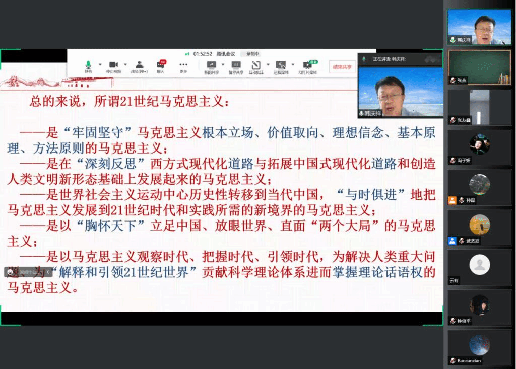 6月9号上午,北外马克思主义讲堂第九期以线上会议的形式成功举办。中央党校一级教授、中央党校专家工作组领衔专家韩庆祥教授受邀出任本次活动的主讲人,并以“21世纪马克思主义的理论阐释”为题做了报告。本次讲座由BB贝博艾弗森官网院长韩强教授主持,共有包括北外马院师生在内的全国高校师生300余人参会。