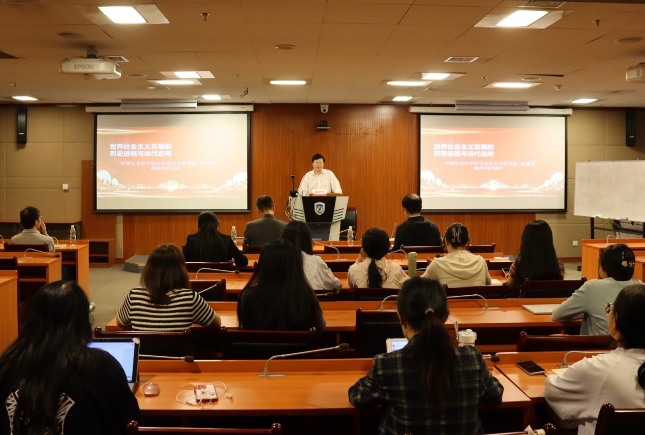 讲座伊始,林建华从习近平总书记的一个结论、一个问题出发,详细阐释了社会主义五百年六个时间段的划分情况,并对研究世界社会主义的历史进程所需掌握的一些基本知识作了介绍。他认为,现在社会主义从遭受严重曲折走向重新振兴,正在展现出光明的发展前景。他进而指出,从世界范围来看,社会主义先后经历了从空想走向科学、从理论走向实践、从一国走向多国、从曲折走向振兴的发展过程。