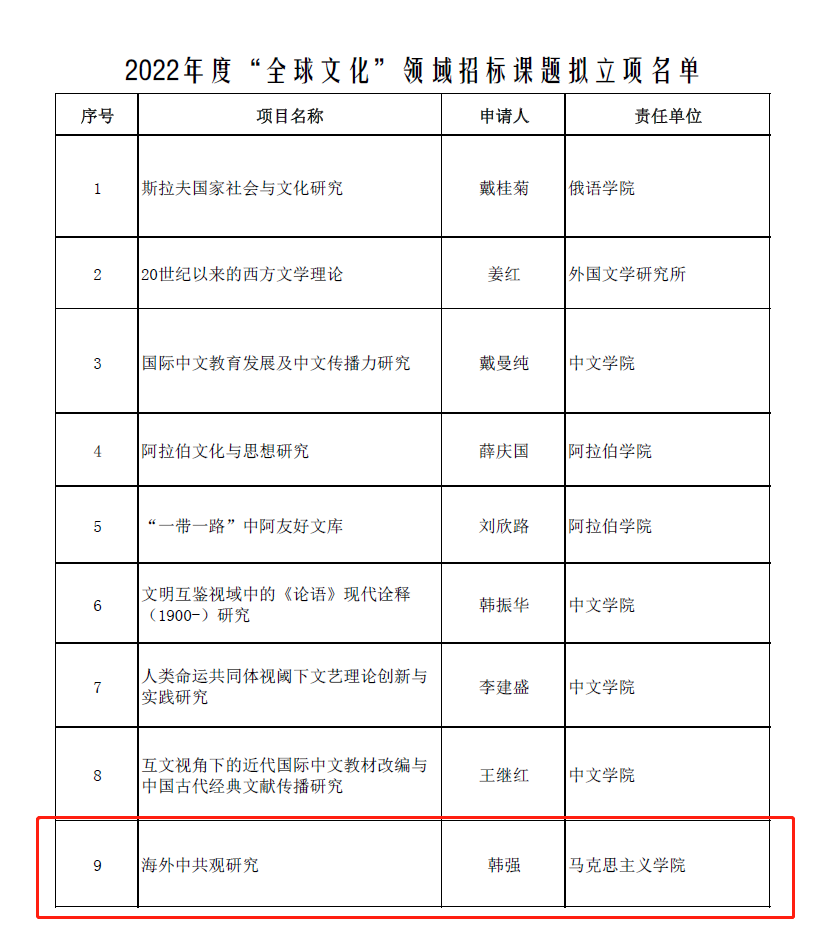经全校教师自主申报、协作组答辩评审、学校“双一流”重大标志性成果工作组审定,BB贝博韩强教授课题“海外中共观研究”入选北外“双一流”全球文化类重大(点)项目。