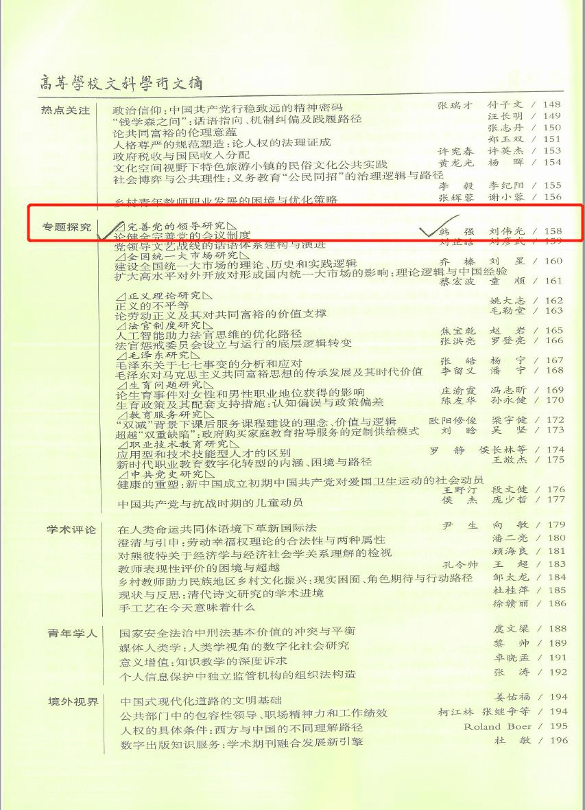 近日,BB贝博韩强教授文章《论健全完善党的会议制度》被《高等学校文科学术文摘》(2022年第6期)全文转载,文章原文发表于《探索》(2022年第5期)。