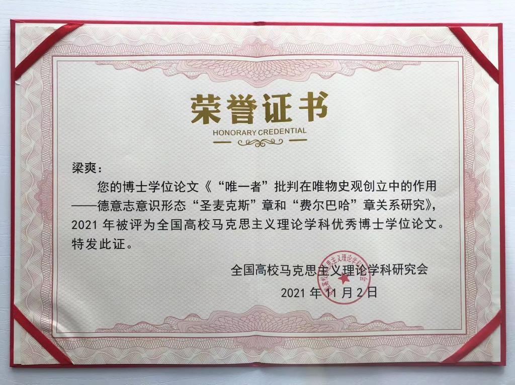 2023年11月4日,由全国高校马克思主义理论学科研究会主办的全国高校马克思主义理论学科博导论坛暨全国高校马克思主义理论学科优秀博士学位论文颁奖典礼在安徽师范大学举行,会议对2021—2023年度全国高校马克思主义理论学科优秀博士学位论文奖获得者进行了表彰。BB贝博教师梁爽获此奖项。