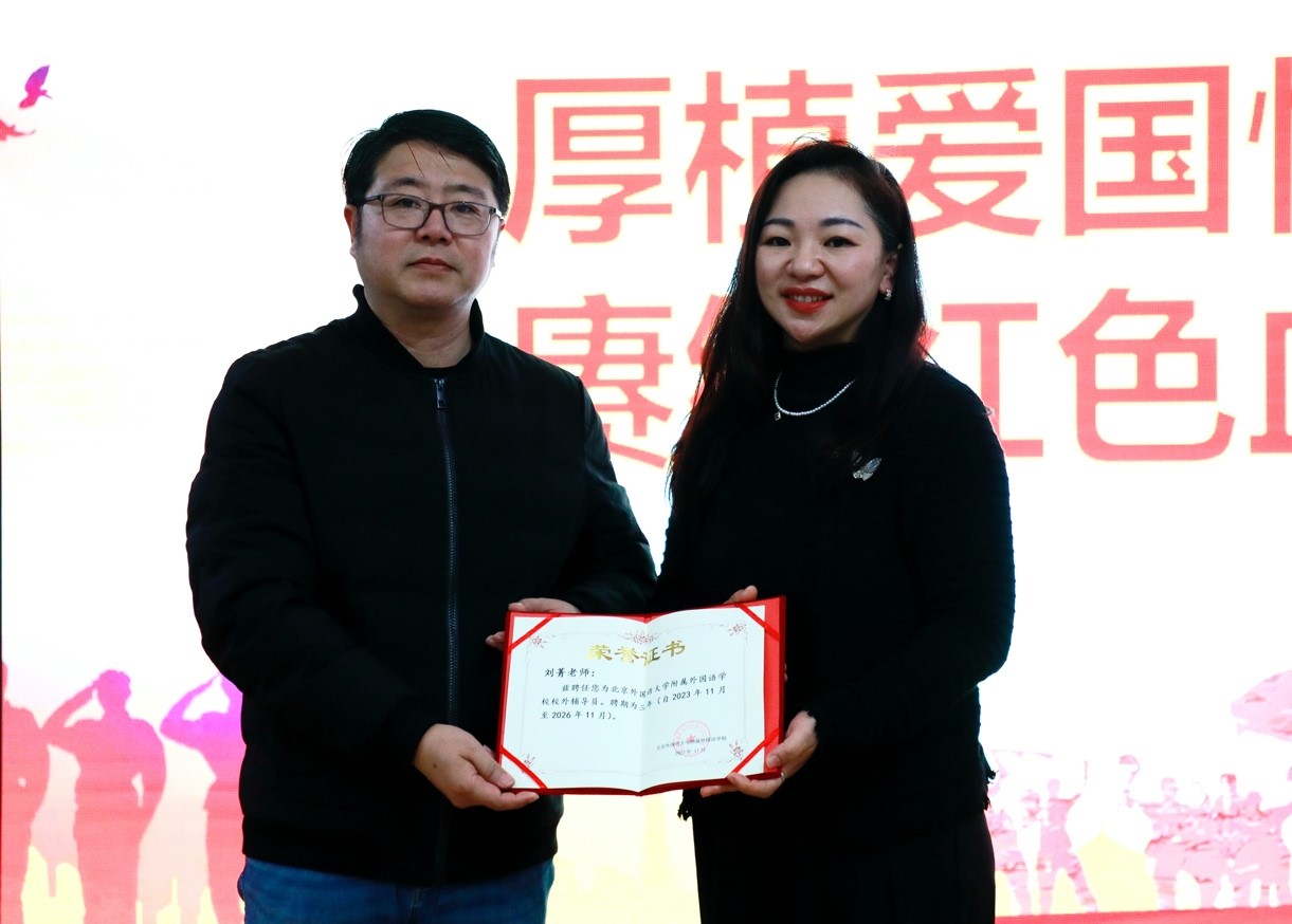 讲座结束,学生发展中心主任杨磊副校长代表学校,向刘菁老师颁发了“北外附校校外辅导员”证书。