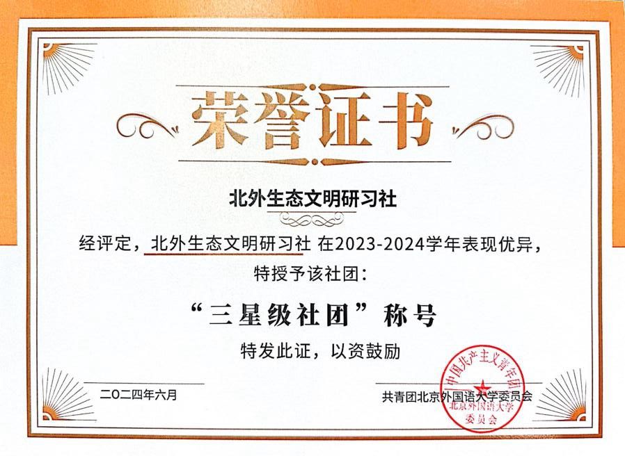 6月12日,BB贝博艾弗森官网举行2023-2024学年社团星级大会。社团工作部对过去一年的社团工作进行了总结,并公布了星级社团评审结果。经评选,北外生态文明研习社荣获BB贝博艾弗森官网2023-2024学年“三星级社团”称号。