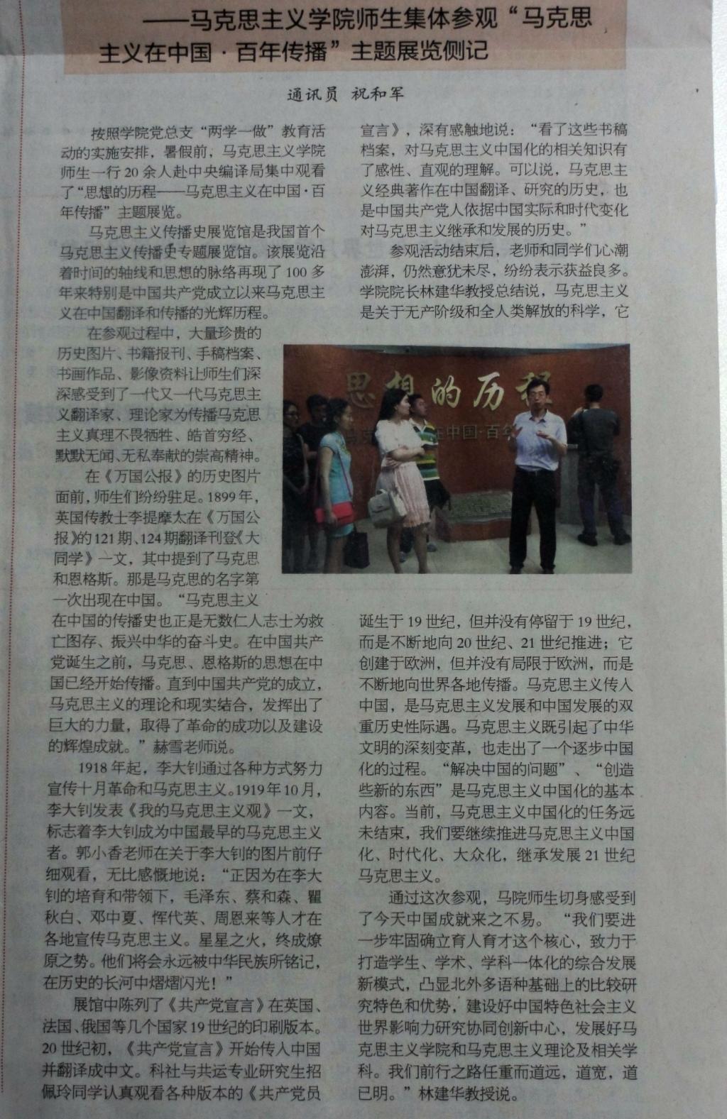 参观活动结束后,老师和同学们心潮澎湃,仍然意犹未尽,纷纷表示获益良多。学院院长林建华教授总结说,马克思主义是关于无产阶级和全人类解放的科学,它诞生于19世纪,但并没有停留于19世纪,而是不断地向20世纪、21世纪推进;它创建于欧洲,但并没有局限于欧洲,而是不断地向世界各地传播。马克思主义传入中国,是马克思主义发展和中国发展的双重历史性际遇。马克思主义既引起了中华文明的深刻变革,也走出了一个逐步中国化的过程。“解决中国的问题”、“创造些新的东西”是马克思主义中国化的基本内容。当前,马克思主义中国化的任务远未结束,我们要继续推进马克思主义中国化、时代化、大众化,继续发展21世纪马克思主义。
