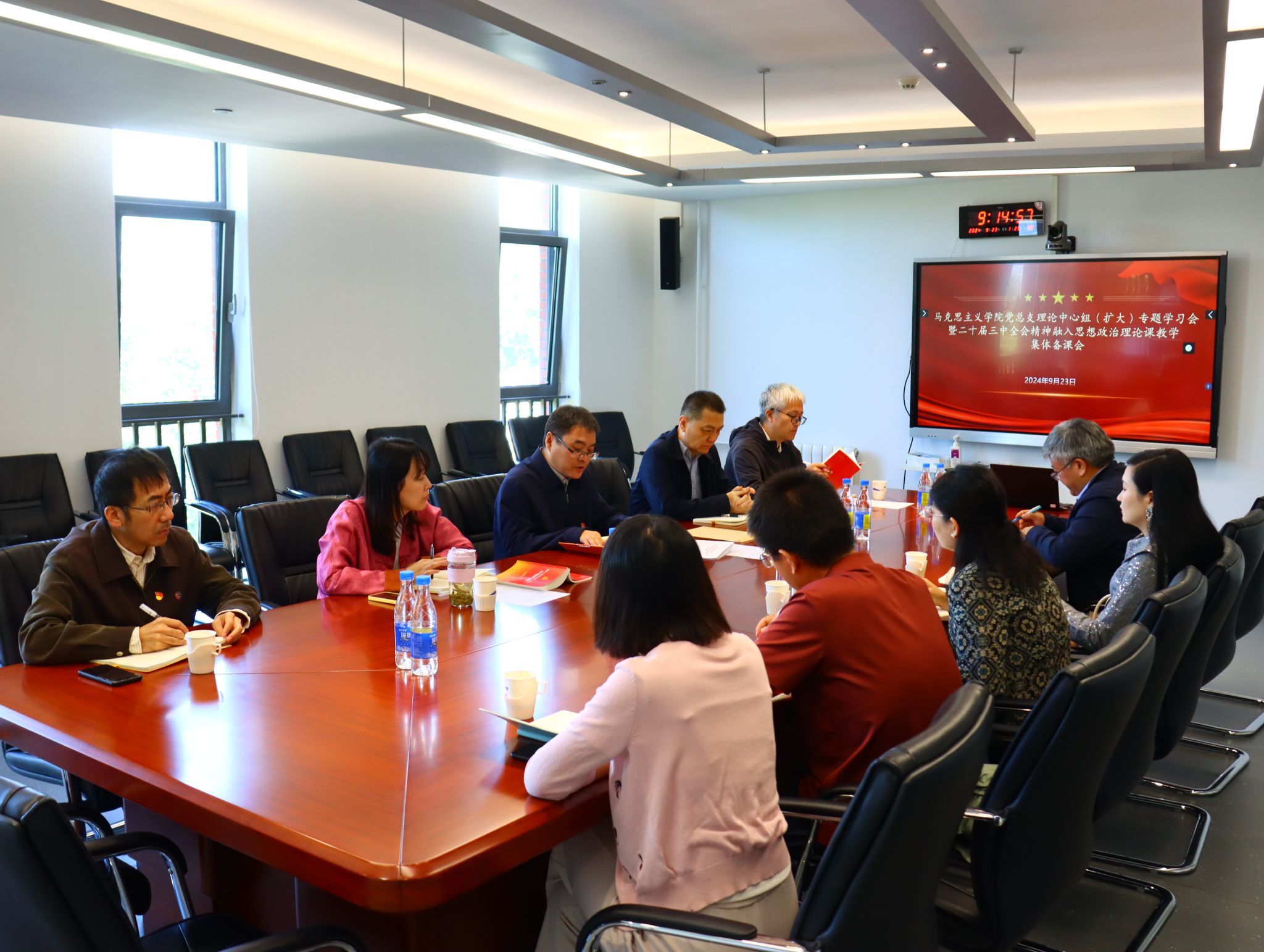 为学习贯彻党的二十届三中全会精神和全国教育大会精神,进一步推动党的二十届三中全会精神有机融入思政课教学,9月23日,BB贝博艾弗森官网召开党总支理论中心组(扩大)专题学习会暨党的二十届三中全会精神融入思政课教学集体备课会。学院党政班子成员,理论学习中心组成员、各教研室主任、教工党支部书记、学生党支部书记参加会议。会议由党总支委员、副院长王曼倩主持。