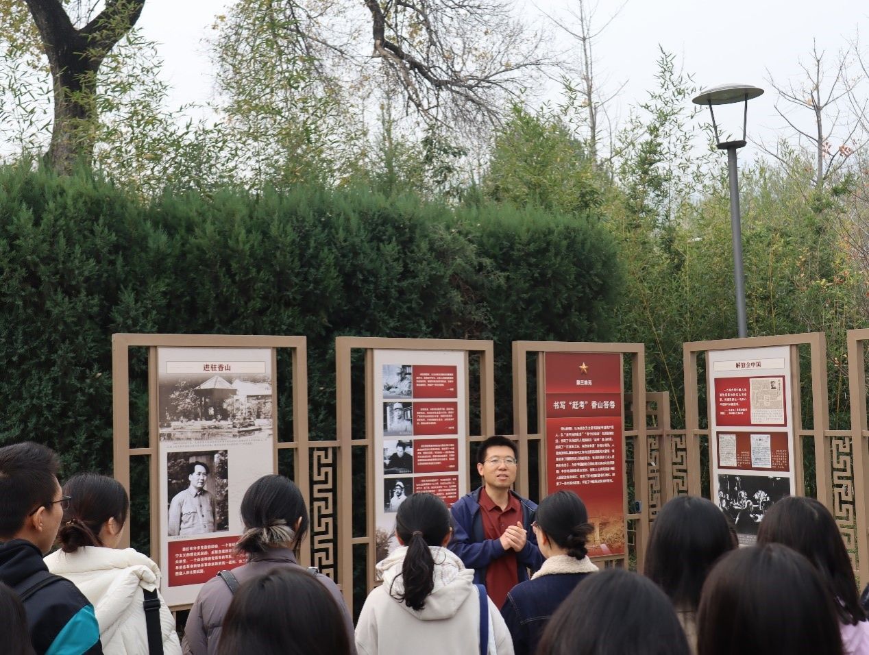 “今天是进京的日子,进京赶考去。”1949年3月23日,毛泽东等中央领导同志率领中央机关和解放军总部人员离开西柏坡前往北平,进驻香山。中共中央在香山虽然只有半年时间,但这里是毛泽东、朱德同志发布向全国进军命令的地方,是中国人民解放战争走向全国性胜利的总指挥部,是中国革命重心从农村转向城市的第一站,是中共中央为筹建新中国搭建四梁八柱的指挥所,在中国共产党历史、中华人民共和国历史上具有非常重要的地位。在参观前,王成诚老师为同学们生动讲述了这段党史,并提问“在香山时期,中国共产党完成了哪五件大事,从而促成了历史的伟大转折?”随后同学们带着问题进行参观游览。